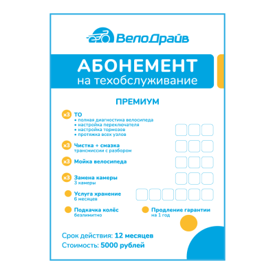 Спешите купить Абонемент на техобслуживание Премиум по цене 5 000 руб. в Санкт-Петербурге и других городах России в интернет-магазине ВелоДрайв.